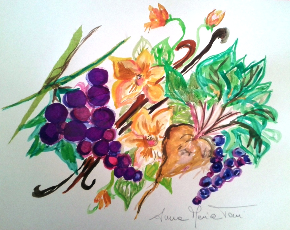 Uva, fiori di vaniglia, barbabietola da zucchero, acquerello di Anna Maria Tani