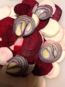 Affettare sottilissimo con la mandolina il cavolo rapa e disporlo su ciascun piatto a coprire il fondo, poi versare alcune gocce di emulsione a condimento, quindi affettare allo stesso modo le rape, il daikon e la barbabietola e disporre sui piatti le rondelle per ottenere strati di colore differente, condire ogni strato con gocce di emulsione. Affettare la zucchina, disporla per ultima sopra le rape, condire e infine ricoprire con rondelline di ravanelli e con quel che resta dell’emulsione.