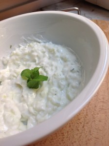 Lavo il cetriolo e ne uso circa la metà. Lo taglio in due per il lungo e tolgo la parte interna coi semini, poi lo trito finemente con l’aglio e la menta. Mescolo il tritato in una ciotolina con lo yogurt, aggiungo un po’ di sale, un giro d’olio e lo ripongo in frigorifero, se c’è tempo, sennò nel freezer.